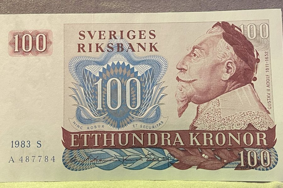 Svensk sedel om 100 kronor från år 1983. Serienummer: A 487784