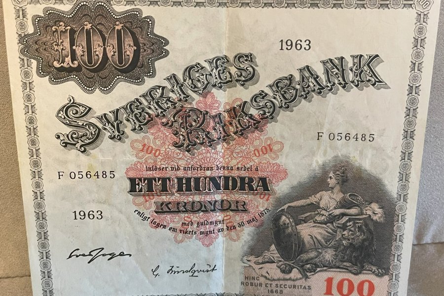 En 100 kronor sedel från Sveriges Riksbank. Årtalet är 1963 och serienumret är F 056485.