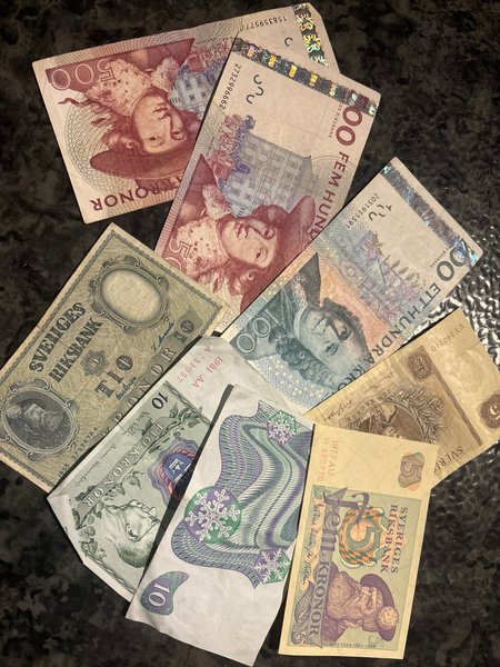 Fem hundra kronor sedel med serienummer 158359577. Fem hundra kronor sedel med serienummer 2732996662. Ett hundra kronor sedel med serienummer 2051911591. Fem kronor sedel från 1977 med serienummer H 892770. Fem kronor sedel med serienummer UY140210. Tio kronor sedel från 1981 med serienummer A 751957. Tio kronor sedel från 1953 med serienummer 27576764.