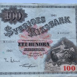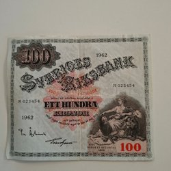 100 sedel från Sverige. Sedeln är från 1628 och har ett värde av 100.
