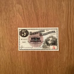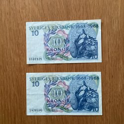 Två svenska sedlar. Den övre sedeln är från 1974 med ett valör 5 kronor och serienummer R 895955. Den nedre sedeln är från 1956 med valör 5 kronor och serienummer KD 667211.