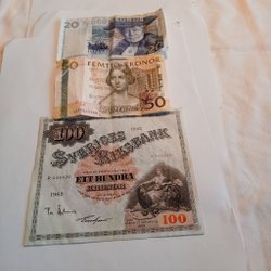 Svenska sedlar från olika år och valörer. Inkluderar en 100-kronorssedel från 1962 med serienummer F 071381, en 5-kronorssedel från 1963 med serienummer UQ 530937, en 10-kronorssedel från 1959 med serienummer 00051558, två 20-kronorssedlar med serienummer 2730436950, en 5-kronorssedel, två 10-kronorssedlar från 1985 G med serienummer E 520471 och 1989 FF med serienummer C 738117, samt en 10-kronorssedel.