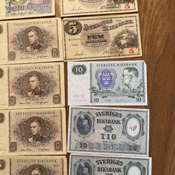 Svenska sedlar från olika år och valörer. Inkluderar en 1-krona från 1914, en 5-krona från 1963 med serienummer AP 707588, en 5-krona från 1943 med serienummer C.699706, en 10-krona från 1958 med serienummer 0882374, en 10-krona från 1953 med serienummer 15950681, en 10-krona från 1968 med serienummer 1386985, en 20-krona med serienummer 6440273574, samt flera 5-kronor från 1978 och 1979 med serienummer B 359643, C 575911, B 333926, B 24831, C 635333, C 794153 och B 824831. Dessutom finns flera 10-kronor från 1984 med serienummer C 580294, C 59314 och B 883370.