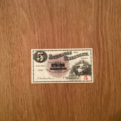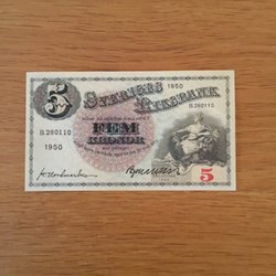Två svenska sedlar. Den övre sedeln är från 1974 med ett valör 5 kronor och serienummer R 895955. Den nedre sedeln är från 1956 med valör 5 kronor och serienummer KD 667211.
