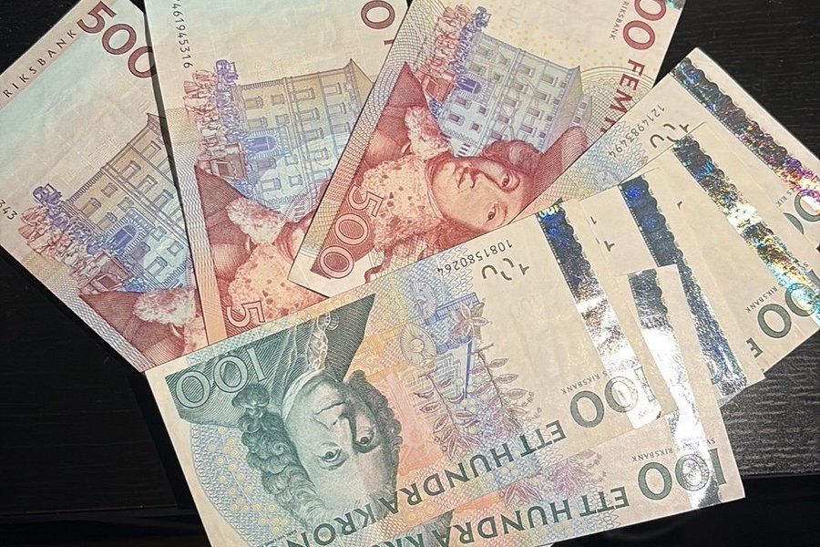 Tre 500-kronorssedlar med serienummer 262214004, 7461945316 och 1081580264. Två 100-kronorssedlar med serienummer 1214983494 och 1081580264.