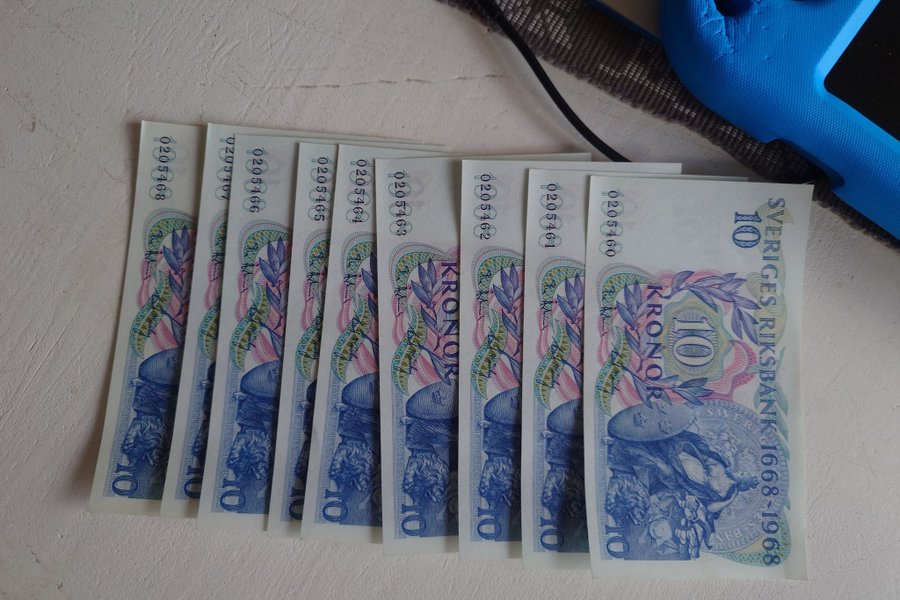 Svenska 10-kronorssedlar från 1968. Sedlarna har serienummer 0205460, 0205461, 0205462, 0205463, 0205464, 0205465, 0205466, 0205467 och 0205468.