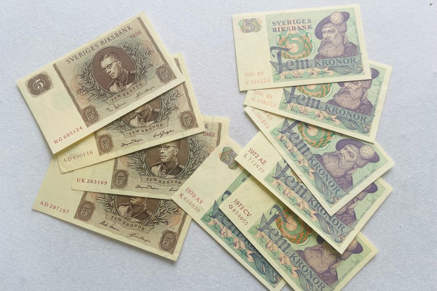 Fem 5-kronorssedlar från 1956 med serienummer NG 695124, AD 690116, UK 263169, AD 297197 och K 616030. Fem 5-kronorssedlar från 1981, 1970, 1972 och 1973 med serienummer A 326524, A 326523, A 395873, K 616030, L 712822 och O 854055.