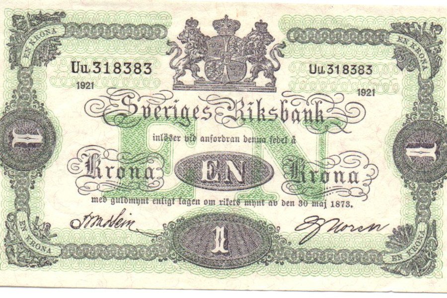 Sveriges Riksbank sedel från 1921. Valören är 1 Krona. Sedeln har serienummer Uu.318383.
