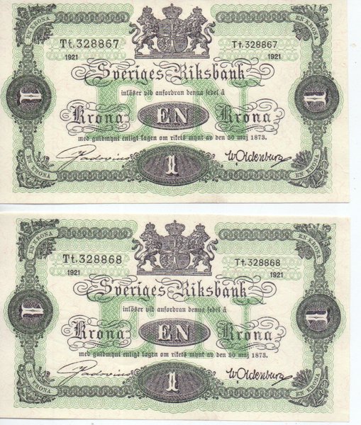 Två svenska sedlar från 1921. Sedlarna har ett värde av 1 Krona vardera. Serienumren är Tt.328867 och Tt.328868.