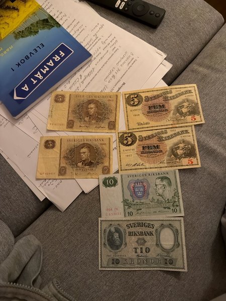 Fem svenska sedlar. Två 5-kronorssedlar från 1949 med serienummer K.430701 och C.405746. En 5-kronorssedel från 1963 med serienummer BR 627095. En 5-kronorssedel från 1960 med serienummer QF 429431. En 10-kronorssedel från 1984 med serienummer C 833023. En 10-kronorssedel från 1962 med serienummer 02099665.