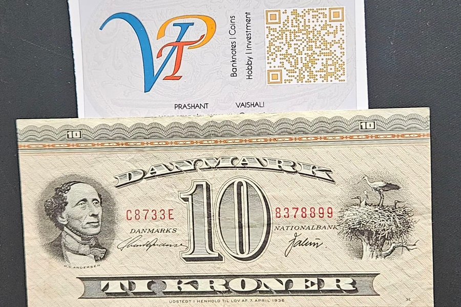 Her er en 10 Kroner seddel fra Danmark. Sedlen er udstedt i henhold til lov af 7. april 1936. cirkulerande tillstånd. Se bild