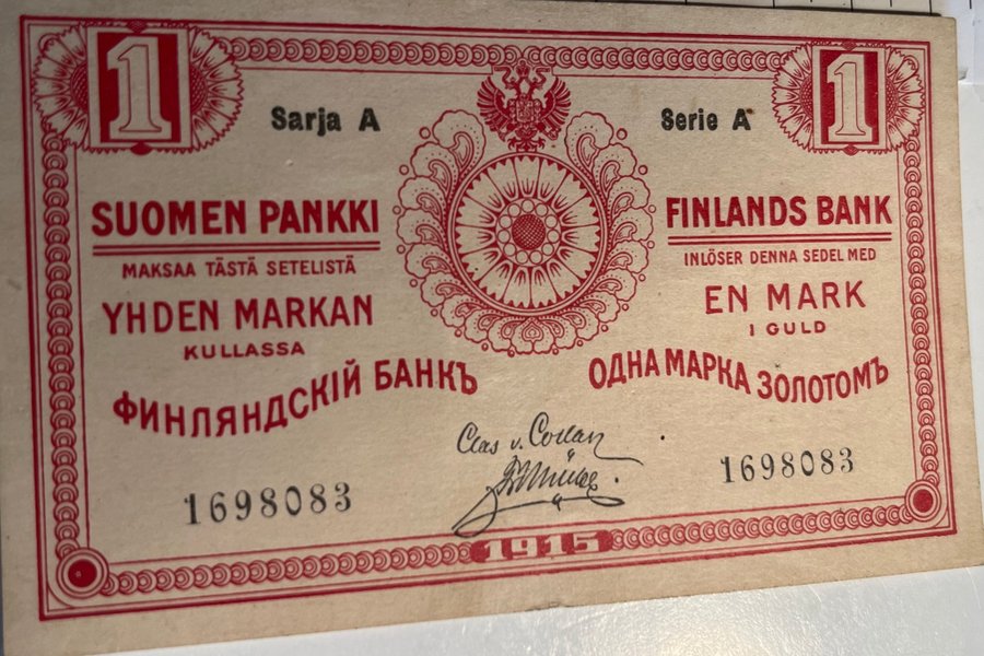 1 Mark 1915.Blank baksida. Ovikt, felfri.