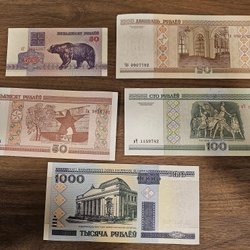 Samling av Belarus sedlar med värdena 10, 25, 100, 1000 och 5000 rubel.
