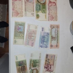 En samling av sedlar. Inkluderar en sedel från Tjeckoslovakien, värd 10 Korun. En sedel från Ukraina, tryckt 1993, värd 50000 karbovanets. Serienummer 827938. Jugoslavien, Kroatien 25 dinara, Sovjetunionen 1 rubel, serienummer AD1290500.