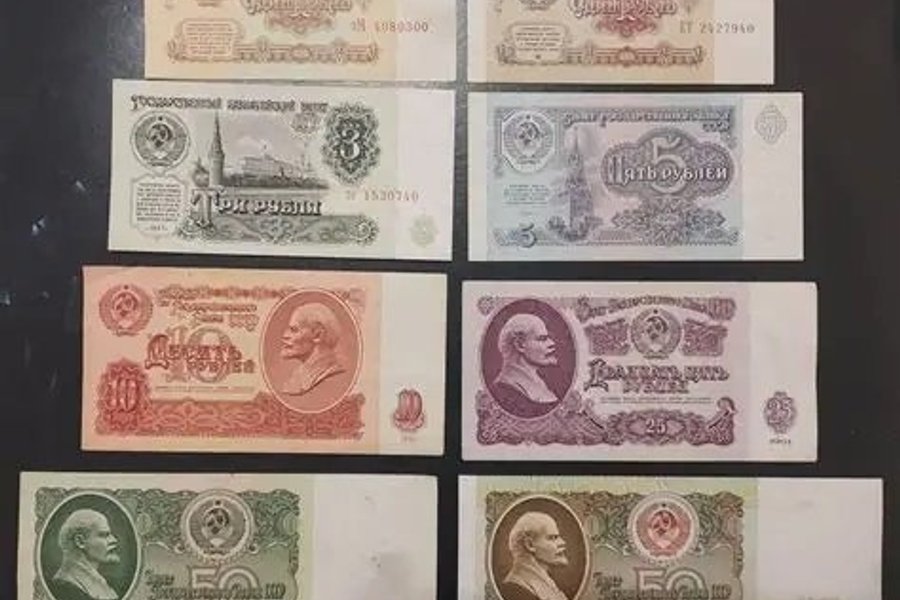 Samling av sovjetiska sedlar. Inkluderar sedlar med valörerna 5 och 10 rubel. Årtal på sedlarna är 1961. Serienummer på 1 rubel sedlarna är ? 4080300 och ?? 2427940. Serienummer på 3 rubel sedeln är ? 1520740.