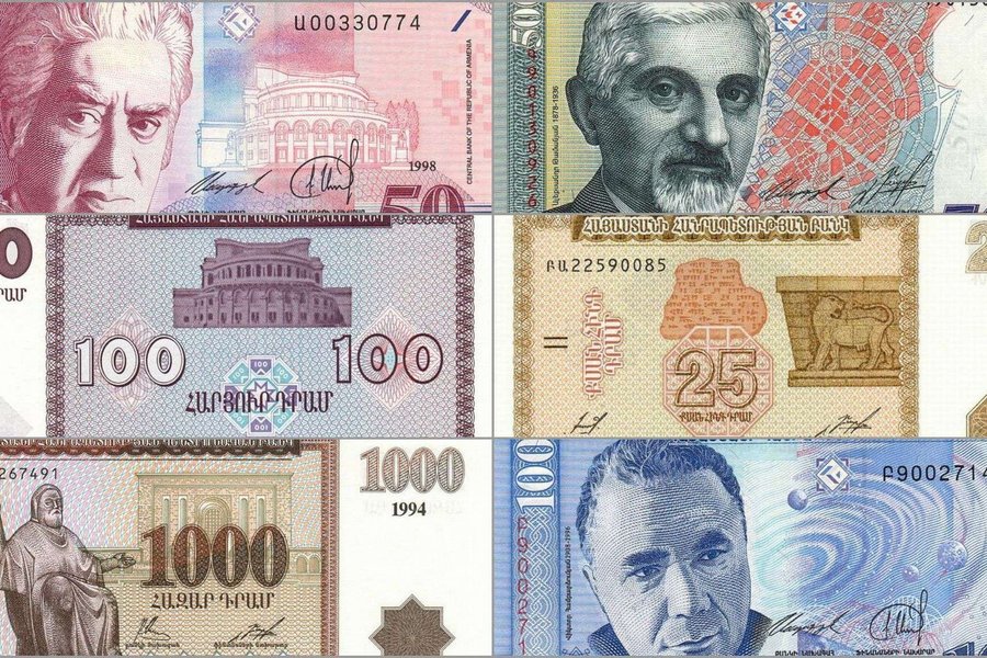 Här är en samling armeniska sedlar med olika valörer och årtal. Sedlarna inkluderar: 10 dram från 1998 med serienummer U00330774, 25 dram från 1993 med serienummer AU22590085