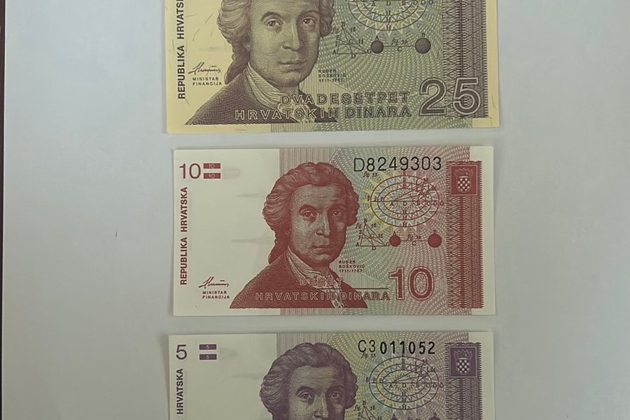 Denna uppsättning innehåller tre sedlar från Kroatien. En sedel har ett värde av 25 HRVATSKIH DINARA med serienummer 2320892725. En annan sedel har ett värde av 10 HRVATSKIH DINARA med serienummer D8249303. Den tredje sedeln har ett värde av 5 HRVATSKIH DINARA med serienummer C3011052.