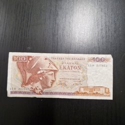 Grekisk sedel med värdet 100 Drachmai från 1967. Serienummer 08P 916869.