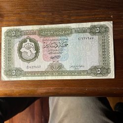 Libysk sedel med värdet en kvarts dinar. Serienummer 2E 174374.