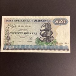 Zimbabwe sedel med värde 2 dollar. Årtal 1983. Serienummer AB 6028892 S.