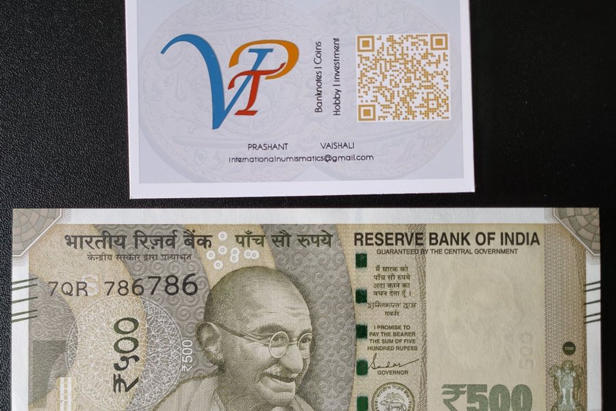 Indisk seddel med en værdi på 500 rupees. Serienummeret er 7QR 786786.