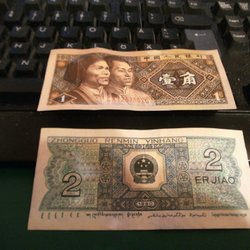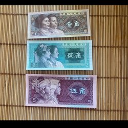 En samling kinesiska sedlar. Inkluderar en 1 Yuan sedel från 1999 med serienummer AWI2189766, en 5 Yuan sedel från 2005 med serienummer IH01947210, och två 1 Jiao sedlar med serienummer B10690488 och B110368842. Brevporto Ej spårbart