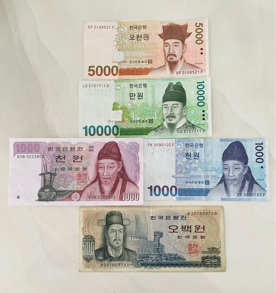 Samling av koreanska won sedlar. Inkluderar 5000 won med serienummer EF 0108521 F, 10000 won med serienummer LD 2151711 D, två 1000 won sedlar med serienummer FK 3090102 F och ??? 0223803, och en 500 won sedel med serienummer ?20160975?.