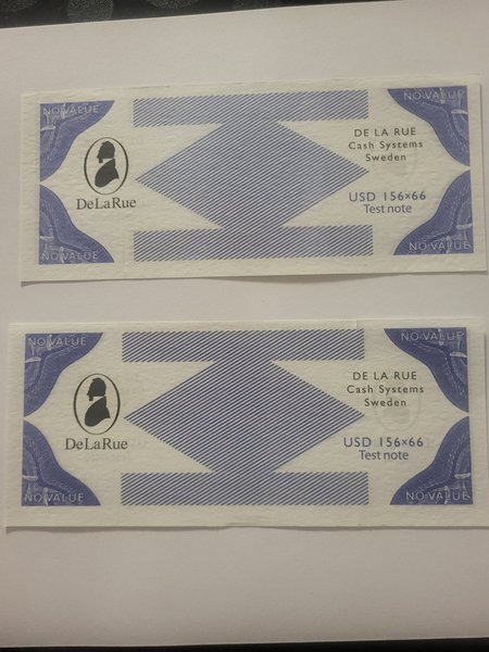 Detta är en testsedel från De La Rue Cash Systems i Sverige. Sedeln har texten "NO VALUE" och "Test note". Måtten är 156x66 USD.