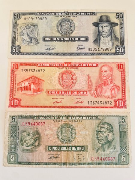 Tre peruanska sedlar. Inkluderar 50 Soles de Oro från 1972 med serienummer H109179989, 10 Soles de Oro från 1973 med serienummer I357634872 och 5 Soles de Oro från 1969 med serienummer J159440687.