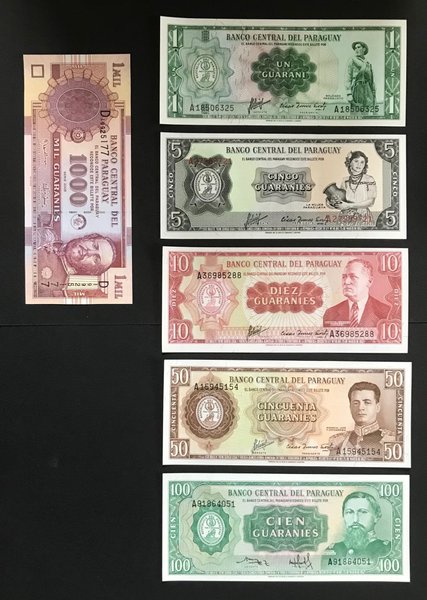 Samling av Paraguayanska sedlar. Inkluderar 1, 5, 10, 50 och 100 Guaranies sedlar.