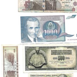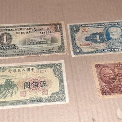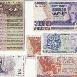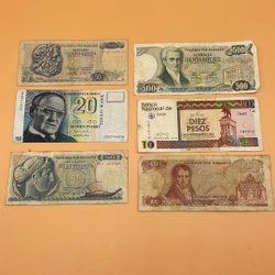 En samling av utländska sedlar från olika länder. Inkluderar sedlar från Spanien (100 Pesetas), Peru (50, 100, 500 och 1000 Intis), Cypern (1 Lira) och Grekland (1000 Drachmai). Vissa sedlar har synliga serienummer och årtal.