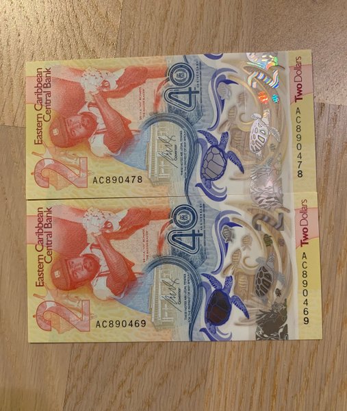 Två Eastern Caribbean Central Bank sedlar.