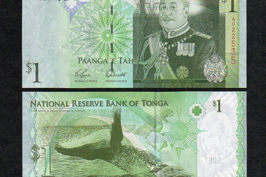 Sedel från Tonga. Valör: 1 Pa?anga. Serienummer stämmer ej med sedeln.