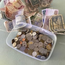 Parti med udenlandske pengesedler. Inkluderer en 500 Quinquentos Meticais, en 100 Baht fra Thailand, en 10 rubel fra Rusland med serienummer eX 5294790, en 5000 dinar fra SFR Jugoslavien, en 500 drachmer fra Grækenland, en 5000 zloty fra Polen, en 20 dinar fra Jugoslavien, en 10 dinar fra Jugoslavien og en 5 tugrik fra Mongoliet med serienummer AB0166215.