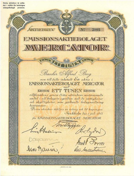 Emissions AB Mercator, 1 000 kronor, 1917, Stockholm, utställd på Bankir Alfred Berg, dekorativ