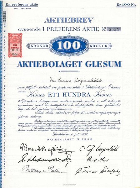 Glesum, AB, 100 kronor, 1934, Stockholm + kuponger
