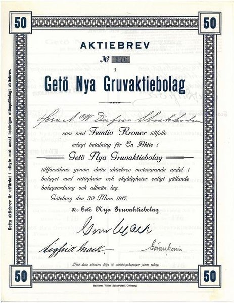 Getö Nya Gruf AB, 50 kronor, 1917, Göteborg, utställd på Herr A.W. Dufwa, + kuponger