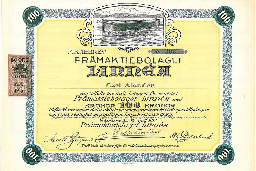 Pråm AB Linnea, 100 kr, 1917, Göteborg, med Kuponger o Bolagsordning, utställd på Carl Alander med kuponger och bolagsordning, dekorativ.