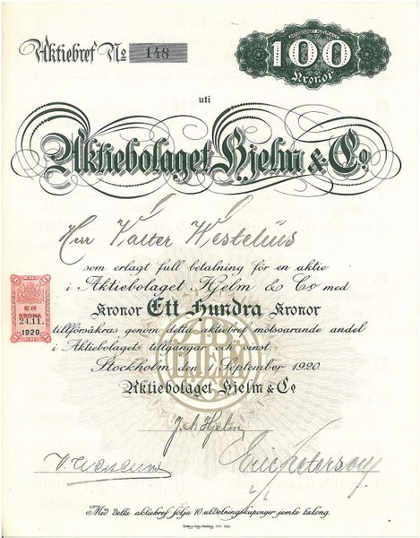 Hjelm & Co, AB, 100 kr, 1920, Stockholm, utställd på Herr Westelius, + kuponger