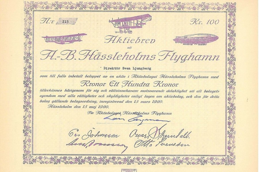 Hässleholms Flyghamn, AB, 100 kr, 1920, Hässleholm, utställd på Direktör Sven Ljungberg, + kuponger o bolagsordning.