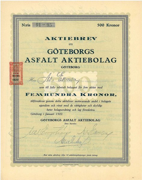 Göteborgs Asfalt AB, 500 kronor, 1922, Göteborg, Utställd o undert. Axel Engström. + kuponger