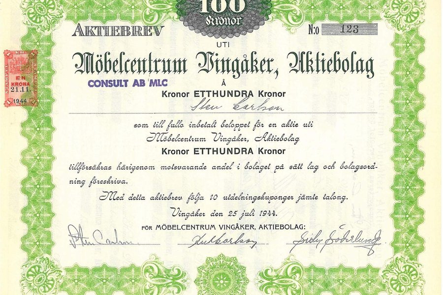 Möbelcentrum Vingåker, AB1, 00 kr, 1944, Vingåker, Referens: GA.2872, med kuponger. 23 x 28,5 cm