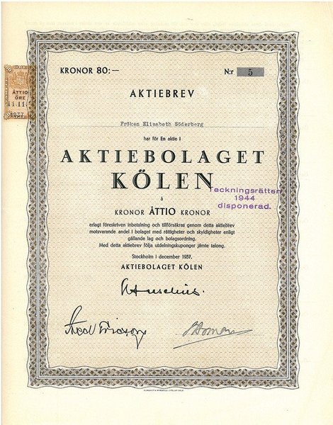 Kölen, AB, 1937, 80 kr, Stockholm, vikt hörn