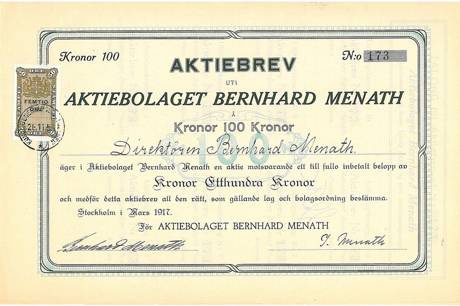 Bernhard Menath, AB, 1917, 100 kr, Stockholm. 24,5 cm x 16 cm,
