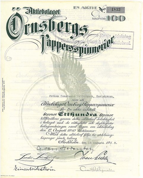 Örnsbergs Pappersspinnerier, AB, 100 kr, 1918, Stockholm, Referens: GA.5609, bild, med talonger