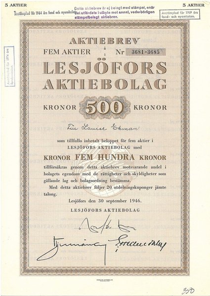Lesjöfors, AB, 500 kr, 1946, Lesjöfors, Referens: GA.(2454), dek.