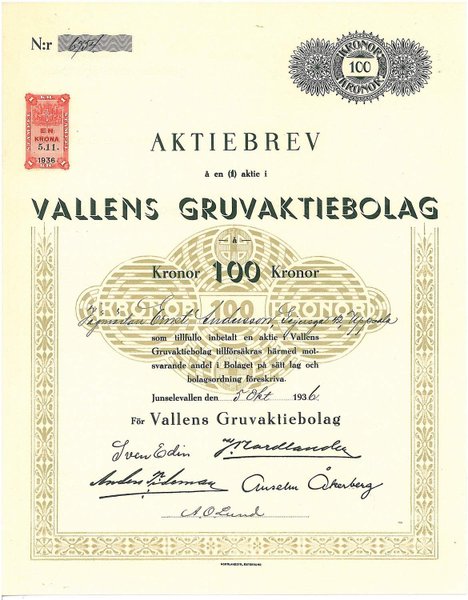 Vallens Gruv AB, 100 kr, 1936, Jungselevallen, Referens: GA.5065
