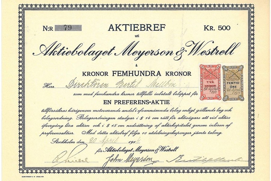 Meyerson & Westrell, AB, 500 kr, 1914, Stockholm, Referens: GA.2777, storlek 27x20 cm.