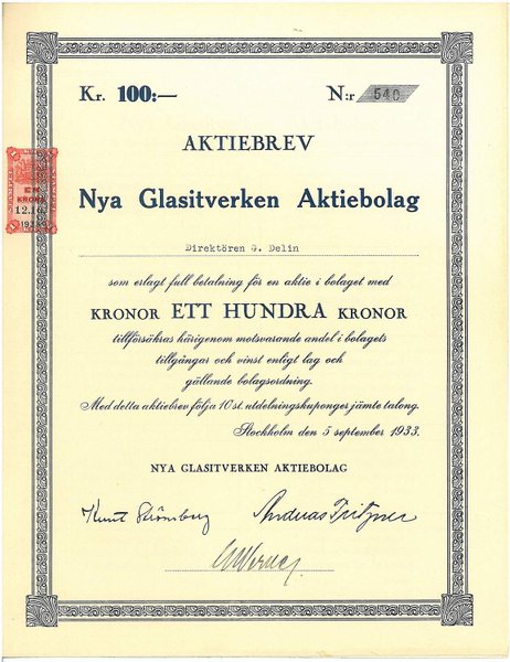 Nya Glasitverken AB, 100 kr, 1933, Stockholm V A200:-Referens: GA.----