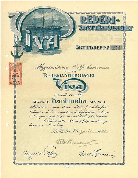 Rederi AB Viva, 1920, 500 kr, Stockholm, hålslag, utställd på skeppsmäklaren C. Hj. Cedervall, dekorativ. storlek 22x29 cm.